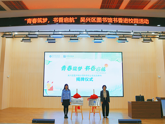 隨后,王奕館長與陸婷副校長共同為“吳興區(qū)圖書館浙江信息工程學(xué)校分館”和“浙江信息工程學(xué)校駱駝公益實踐基地”揭牌。兩萬冊書籍的入駐,標(biāo)志著校館合作開啟新篇章,也為校園文化育人注入新動能。