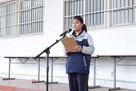 高一26班的來孜娜?木熱阿力木作為學生代表上臺發言。她分享了先烈們為理想信念舍生忘死的英勇事跡,她呼吁同學們,要以先烈為榜樣,珍惜當下的和平與安寧,努力學習知識,為實現中華民族偉大復興的中國夢貢獻力量。