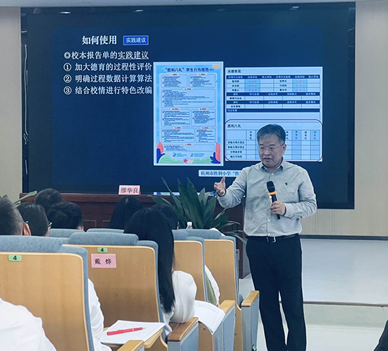 杭州市上城區教育評估與監測中心書記、主任兼杭州市上城區教育學院副院長繆華良作了《深化小學綜合評價改革的方式運用與策略創新》的報告。繆華良從“‘以評促育’—小學生綜合評價改革的追求”“小學生綜合評價改革的實施途徑”“小學生綜合評價改革的技術應用”“小學生綜合評價改革的創新項目”等結合具體案例侃侃而談,憑借深厚的專業知識和豐富的實踐經驗,詳細指導綜合評價的操作方法與流程,秉持“評價成就‘完整的人’”這一先進理念,深刻指出應以全要素融通評價為核心,激勵每個學生積極主動、全方位健康成長,詳細列舉了一系列切實可行的實施路徑。