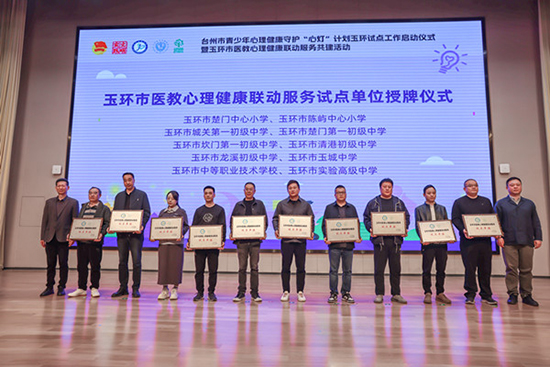 之后,玉環(huán)市教育局黨委委員李旦福、玉環(huán)市衛(wèi)生健康局副局長(zhǎng)張鵬為玉環(huán)市中等職業(yè)技術(shù)學(xué)校、玉環(huán)市楚門(mén)中心小學(xué)、玉環(huán)市陳嶼中心小學(xué)等10家試點(diǎn)學(xué)校授牌,激勵(lì)這些學(xué)校積極探索青少年心理健康教育的新路徑、新方法。