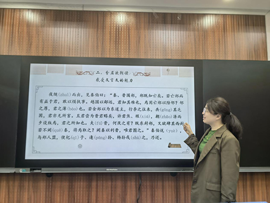 4月10日,諸暨市職業教育中心智慧教室迎來一場語文教學盛宴。由諸暨市教育局職成教負責人潘丹帶隊,兄弟學校骨干教師與本校教師共聚一堂,共同觀摩兩堂極具深度的語文課。鐘陽瓊和王航燕兩位教師分別以《燭之武退秦師》和《“房”中窺人:洞察周樸園》為課題,以策略解構賦能高考實戰,用文本對話叩擊人性深度,為職業教育語文教學改革獻上創新答卷。