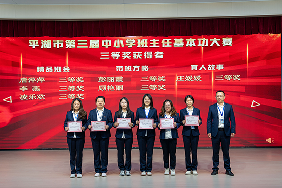 學生處副主任吳梅宣讀校星級班主任名單及平湖市第三屆班主任基本功大賽獲獎名單,獲獎教師上臺,校領導為其頒獎。