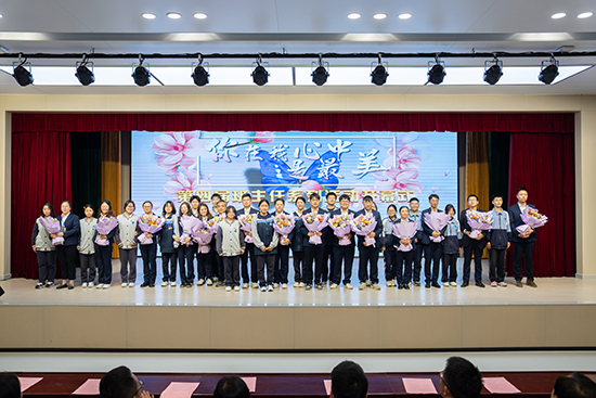 一朝沐杏雨,鮮花謝師恩。所有班主任上臺,學生為他們送上美麗的鮮花,并深情擁抱。此刻,師生之情在此交融升華,譜寫出一曲壯美的育人贊歌。