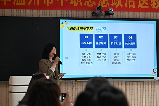 樂清職專的胡娃娃老師帶來了“‘說’出精彩,‘課’顯匠心——中職思想政治說課探析”講座。胡老師從專業(yè)視角對中職思政說課的關(guān)鍵要點展開深度剖析。此外,胡老師還對陳彥芷老師和王嘉以老師的說課內(nèi)容進行了精準(zhǔn)的分析點評,其講解邏輯清晰,讓在場教師對說課有了更為深刻的理解。