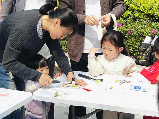 活動另一側(cè)的創(chuàng)意手工區(qū)更是熱鬧非凡,孩子們將采集的各種樹葉通過植物拓印技術(shù)制作成環(huán)保書簽。把樹葉放于書簽上,小木槌輕輕敲擊,葉脈紋理漸漸清晰浮現(xiàn)。“我要把這個‘會呼吸的書簽’夾在日記本里!”7歲的兜兜舉著拓印著四葉草圖案的書簽興奮地說。