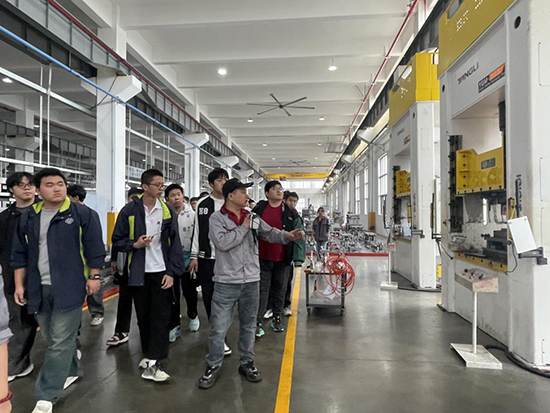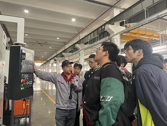 4月24日上午9時(shí),學(xué)生們出發(fā)前往公司,在公司辦公室主任王意博的引領(lǐng)下,學(xué)生們首先參觀了吉沃科技的生產(chǎn)車間。生產(chǎn)線上的工人們熟練地操作著各種高精尖設(shè)備,汽車零部件從原材料到成品的每一個(gè)生產(chǎn)環(huán)節(jié)都盡收眼底。來到模具車間cnc工作區(qū)域,學(xué)生們近距離觀察了工人們?nèi)绾尾僮骶艿臋C(jī)械設(shè)備,大家紛紛感嘆科技企業(yè)的生產(chǎn)環(huán)境像一個(gè)充滿未來感的‘科技實(shí)驗(yàn)室’,并表達(dá)了特別想要進(jìn)入吉沃科技學(xué)習(xí)cnc數(shù)控加工技術(shù)的愿望。