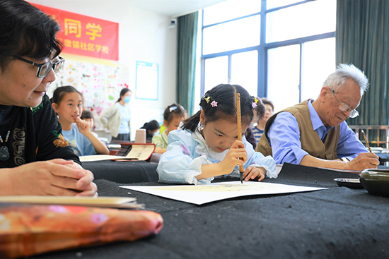 本次活動以“融合”與“互助”為核心理念,精心推出國畫、書法、聲樂、舞蹈、布藝、古箏、手工、英語、走秀等豐富多彩的課程。在三墩鎮社區學校的扇藝課堂上,丁爺爺耐心指導孩子們運筆技巧,從墨色濃淡間感悟中國傳統美學的深厚底蘊;轉塘街道社區學校的合唱教室里,老年學員與孩子們共同演繹歌曲《世界贈予我的》,用歌聲傳遞“以溫柔目光回饋世界”的人生智慧;留下街道社區學校的布藝課上,張奶奶手把手教孩子們縫制小布袋,在一針一線間傳承精益求精的工匠精神。