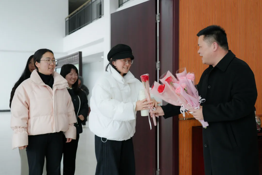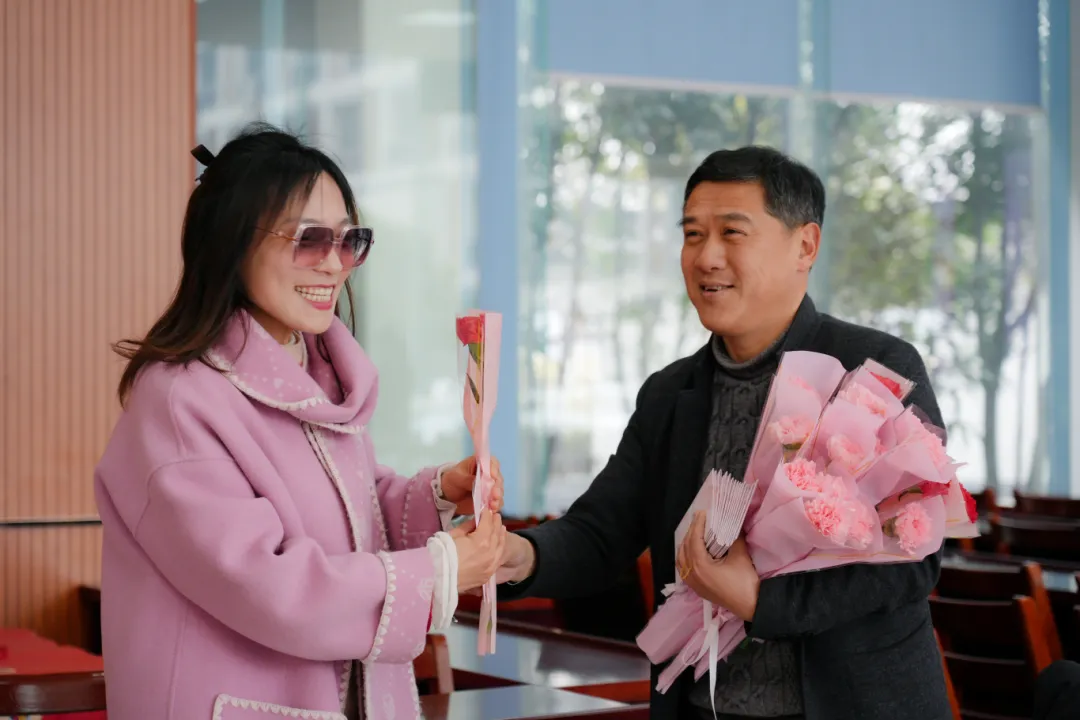 活動當天,校黨委副書記、校長李志文,副校長、工會主席龔磊,副校長葛魁早早便抵達活動現場,他們手捧鮮花,滿臉笑容地迎接每一位女教職工的到來。當女教職工們接過校領導送上的鮮花和祝福時,幸福的笑容在她們臉上綻放開來,恰似春日里盛放的繁花。而這些飽含心意的祝福,是對女教師們日常默默耕耘、辛勤付出認可,如同春日暖陽,驅散寒意,溫暖著每一位女教師的心田。
