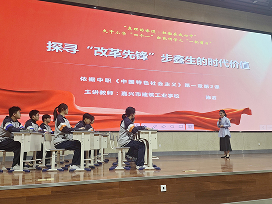 培訓(xùn)期間,學(xué)校思政教研組長陳潔老師受邀參加大中小學(xué)5個(gè)學(xué)段的教學(xué)展示,以“真理的味道 紅船在我心中”大中小學(xué)四個(gè)一紅色研學(xué)之“一把剪刀”中職學(xué)段思政課為主題,呈現(xiàn)了一堂富有職教特色的創(chuàng)新課堂。陳潔老師以“探尋改革先鋒步鑫生的時(shí)代價(jià)值”為課題,引導(dǎo)學(xué)生以設(shè)計(jì)步鑫生紀(jì)念館文創(chuàng)紀(jì)念品為任務(wù),將AI技術(shù)與思政教育深度融合。學(xué)生們通過數(shù)字化手段創(chuàng)作作品,生動(dòng)再現(xiàn)步鑫生的改革創(chuàng)新故事,深刻領(lǐng)悟時(shí)代精神與使命擔(dān)當(dāng)。