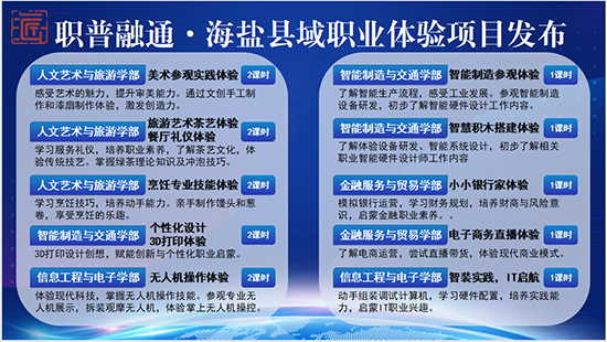 為推進(jìn)“職業(yè)啟蒙”教育,推動職業(yè)理念、職業(yè)技能、職業(yè)素養(yǎng)與普通教育相互融通,海鹽職業(yè)教育中心特組織開展2025年度“職普融通示范日”活動。