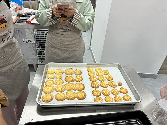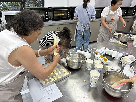 活動現(xiàn)場,烘焙教室彌漫著濃郁的香甜氣息。授課老師呂櫻化身“甜蜜導師”,手把手指導學員們制作曲奇餅干。從稱量面粉、黃油軟化,到混合攪拌、擠壓裱花,每一個步驟呂櫻老師都耐心講解、細致示范。學員們圍在操作臺邊,專注地觀察學習,不時提出疑問,呂老師也一一給予解答。有的學員因身體不便操作略顯笨拙,但在老師和家屬的幫助下,仍努力完成每一個環(huán)節(jié),眼神中滿是對新技能的渴望與認真。?