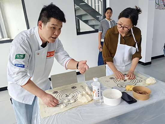 培訓(xùn)現(xiàn)場,專業(yè)面點師陳彬、魏國民為老年學(xué)員們詳細講解了中式面點制作的技巧與方法,從面團的揉制、發(fā)酵,到餡料的調(diào)配,再到造型與烘焙,每一個步驟都耐心指導(dǎo)。學(xué)員們圍在桌前,認真聆聽,不時提出疑問,隨后便迫不及待地動手實踐。大家系著圍裙,專注地揉面、包餡、塑形,互相交流經(jīng)驗,歡聲笑語回蕩在教室中。兩位師傅剛不停地在人群中穿梭指導(dǎo)。