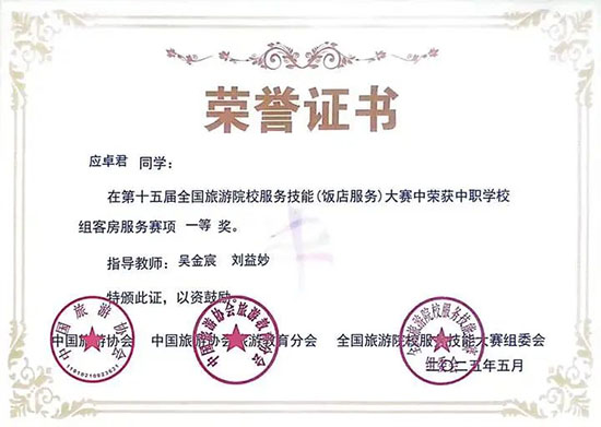 “一張床,三分鐘,誤差不超 1 厘米”—— 這是客房中式鋪床的“毫米級”嚴(yán)苛標(biāo)準(zhǔn)。24 旅游 3+4 班應(yīng)卓君從零起步,經(jīng)吳金宸、劉益妙兩位金牌教練 2 個半月定制化特訓(xùn):從分解動作的毫秒級打磨,到全流程提速增效;從日常訓(xùn)練的百次淬煉,到模擬賽的壓力抗干擾測試。兩位教練以科學(xué)系統(tǒng)的訓(xùn)練體系,為這位首次參賽的小將搭建“技能躍升通道”,最終她以總分第二的亮眼表現(xiàn),斬獲該項目一等獎。