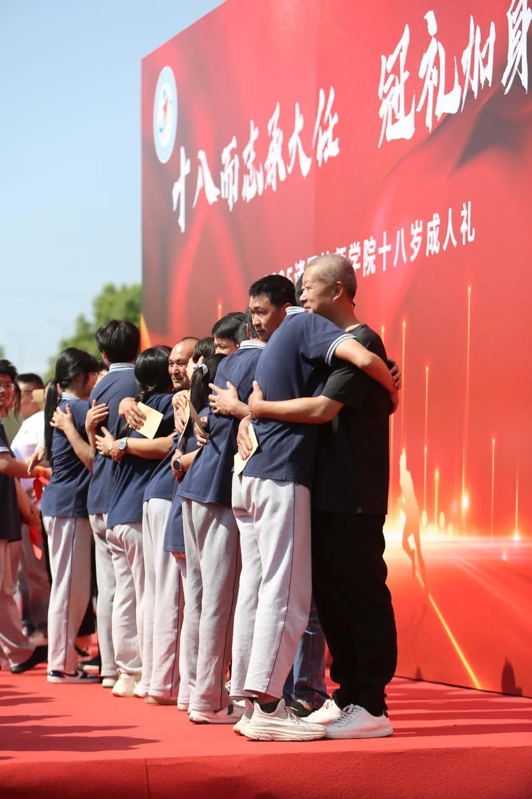 金萍女士代表家長發言。她祝福技師青年揚帆起航,滿載而歸。家長們親手為孩子佩戴上成人徽章、系上祝福絲巾小小的物件,裝滿了沉甸甸的愛與期望。學生捧出親手制作的感恩賀卡,用文字表達對父母的感激,同時向家長和老師道一聲“爸爸媽媽,我愛您!老師,我愛您!”并深情擁抱。在這一刻,所有人的情緒進行釋放,淚灑現場。