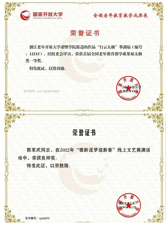 這支平均年齡近70歲的太極隊伍,以“傳幫帶”的階梯式培養構建起可持續發展的生態鏈。老學員化身助教,新學員接力傳承,在晨練暮習中織就縱橫交錯的教學網絡。當太極方陣的颯爽英姿點亮藝術節的舞臺,當太極團隊及學員們在國家開放大學、省、市級武術比賽中屢屢摘金奪銀,獲獎證書和獎牌的背后,不僅是學員們技藝的精進,更是一個個被武術滋養的生命在拳風劍影中翩翩重綻光華……!