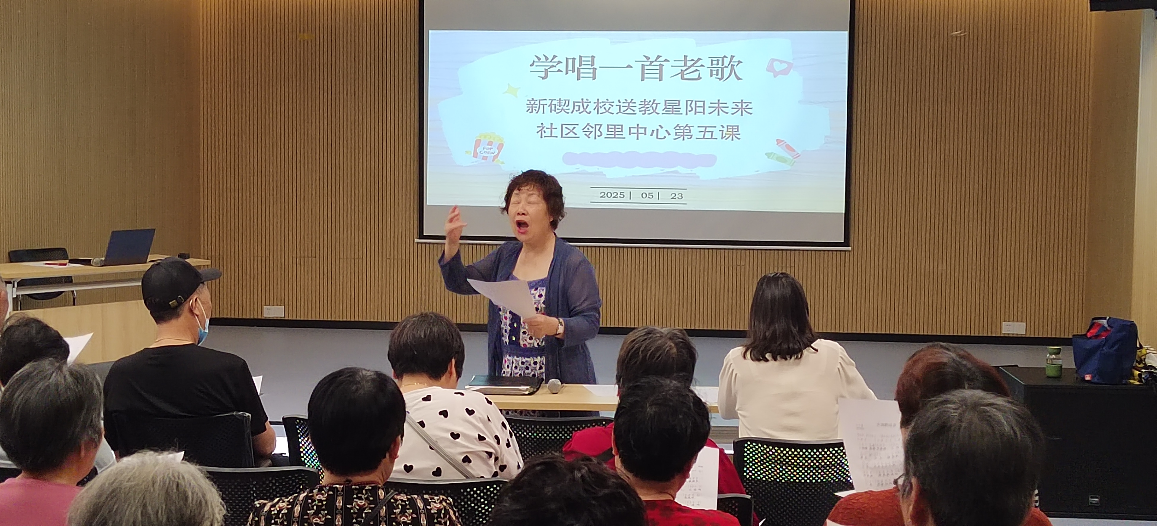 新碶成校送教星陽未來社區鄰里中心活動圓滿收官!在為期五天的系列課程中,從心理健康培訓到經典老歌學唱,豐富多元的課程內容為社區生活注入活力。活動最后一天,一場別開生面的老歌學唱培訓精彩上演,社區居民們齊聚一堂,在悠揚旋律中重溫經典,共同學唱《大海啊故鄉》與《送別》兩首膾炙人口的老歌,用歌聲傳遞情感,為此次送教活動畫上溫馨句號。
