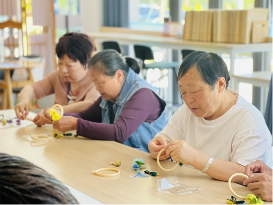 在制作過程中,老人們全神貫注,他們認真地擺弄著手中的材料,眼神中透露出專注與投入。盡管部分老人在操作精細動作時稍顯遲緩,但他們相互幫助、彼此交流,現場充滿了溫暖與協作的氛圍。有的老人遇到難題時,身旁的伙伴會主動伸出援手,共同探討解決辦法;有的老人則發揮創意,為自己的掛件增添獨特元素,現場不時傳來陣陣歡聲笑語。