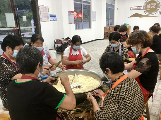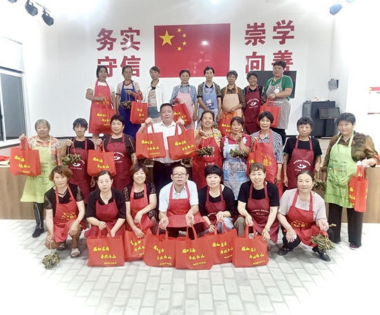 活動現場提前備好糯米、粽葉、五花肉等原料,社區(qū)學校志愿者教師現場示范卷葉、填米、扎繩等傳統(tǒng)包粽技法。村民中既有包粽能手展示嫻熟技藝,也有年輕志愿者邊學邊做,形成“老帶新”的生動場景。