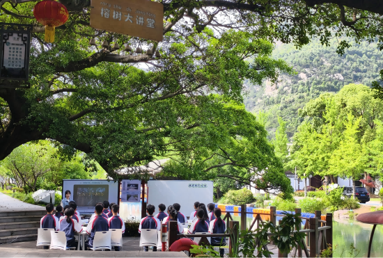 隨即,思政組金崇婧老師在榕樹大講堂與學生探究陳岙村的人與自然相處之道。結合“兩山”理論提出二十周年的歷史節點,引導學生思考“從陳岙看中國”的生態治理智慧:“這里的每一泓清水、每一寸綠蔭,都是‘人與自然和諧共生’現代化理念的鮮活體現,生動詮釋了中國在生態文明建設方面的卓越成就和偉大實踐。”