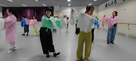 擔任教學的原瑞安市越音芳青藝術團團長潘伯君老師,在點評環節對每位學員進行個性化指導。“看到阿姨們眼中閃爍的光,所有付出都值得。”潘老師表示,教學特別融入越劇方言發音技巧與戲曲身法口訣,讓非遺傳承更“接地氣”。