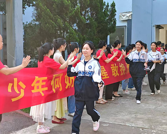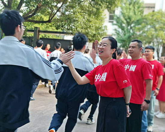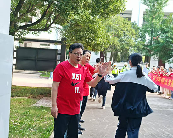 擊掌儀式現(xiàn)場,老師們高聲吶喊“沉著應考,金榜題名”“你們是最棒的”,學生們則信心滿滿,以燦爛的笑容和堅定的目光回應師長的期待。紅色的身影與青春的笑顏交織,成為校園里最動人的風景。