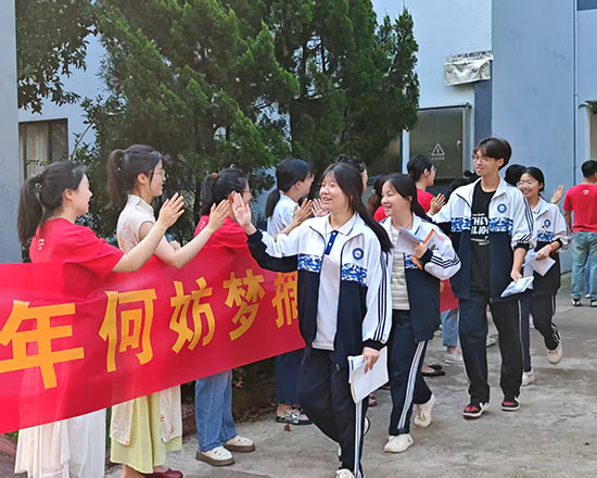 6月7日上午7:20,衢州第二中等專業(yè)學校校園內(nèi)涌動著一片紅色暖流。校領導與高三教師們身著印有“加油100分”的紅色T恤,部分女教師還特意換上寓意“旗開得勝”的旗袍,在高三教學樓下整齊列隊,與即將奔赴考場的高三學子一一擊掌,送上真摯的祝福與鼓勵。