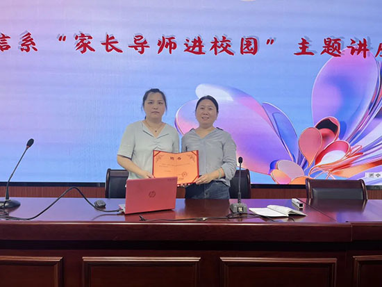 講座結束后,經貿信息系政教主任楊芬為家長頒發聘書。