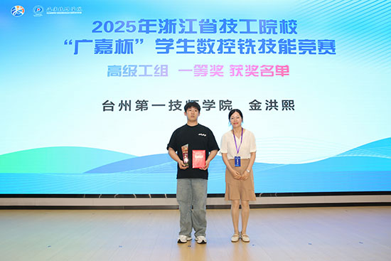 閉幕式上,裁判長邵樹鋒老師對賽事進行專業點評,高度肯定了選手們的技術水平與競技精神,同時強調數控技術在制造業中的核心地位,鼓勵學子們以賽促學、精進技能。本次競賽依托杭州廣嘉機電有限公司等多家技術支持單位的資源支撐,全程對標行業標準,為選手搭建了高規格的技能展示平臺。最后,成績的揭曉把閉幕式推向高潮。通過奮力拼搏,學校馮一航獲得高級工組二等獎,吳宇博獲三等獎。