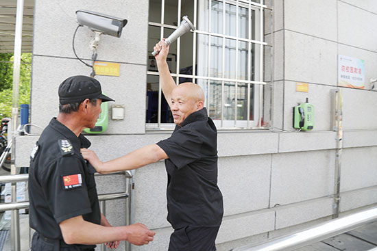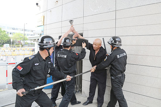 演練模擬極端場景:一名“暴徒”暴力沖破門禁企圖闖入校園。保安團隊迅速啟動應(yīng)急預(yù)案,一方面以盾棍叉三角合圍戰(zhàn)術(shù)牽制嫌疑人,另一方面立即觸發(fā)一鍵報警系統(tǒng)并上報應(yīng)急領(lǐng)導(dǎo)小組。參演人員沉著應(yīng)對,通過戰(zhàn)術(shù)配合成功制服“暴徒”,全程展現(xiàn)“一分鐘反應(yīng)、三分鐘處置”的快速響應(yīng)機制。