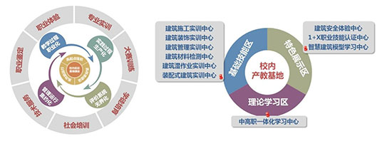這里,以一體化實訓大樓為中樞,“三區十中心”為藍本,以產教深度融合共建共育為路徑,致力于打造一個集職業體驗、專業實訓、大賽集訓、社會培訓、技術服務及職業技能鑒定等功能于一體的“特色鮮明、成效顯著、省內領先”的建筑專業產教融合實訓基地。