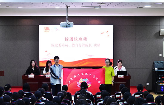 院黨委委員、德育分管院長(zhǎng)唐瑛同志向本期團(tuán)校學(xué)員代表——2412藝術(shù)設(shè)計(jì)班的溫志鵬同學(xué)授予了本期團(tuán)校班旗。徽章與旗幟的傳遞,寓意著組織信任的交付和奮進(jìn)力量的凝聚,激勵(lì)學(xué)員們?cè)诎嗥煲I(lǐng)下團(tuán)結(jié)協(xié)作、銳意進(jìn)取。