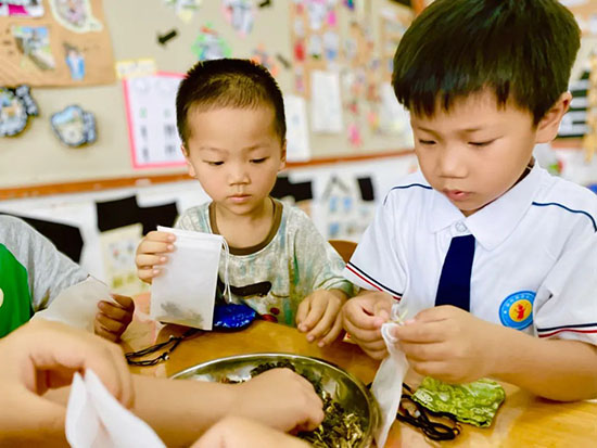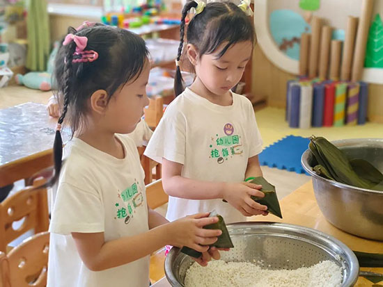 包粽子:“糯米白花花,粽葉手中拿,裹住甜蜜餡,卷起香粽葉,粽子包好啦!”在老師的指導(dǎo)下,幼兒們念叨著兒歌,一手拿粽葉,一手勺糯米,不忘放進(jìn)不同的餡料。不一會(huì)兒,形狀不一的粽子產(chǎn)生了,煮熟,吃著香甜軟糯可口的粽子別提有多開心了。