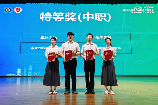 6月21日至23日,第二屆全國職業院校石油和化工類專業教師教學能力大賽決賽在河南應用職業技術學院落下帷幕。平湖市職業中專化工專業教師團隊(沈張迪、朱奕蕾、徐舟英、蔣怡斌)憑借作品《化工流體輸送設備的操作》脫穎而出,以總分第一名的成績斬獲中職組唯一一個特等獎,是學校在該賽項上的又一次重要成果。