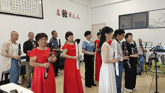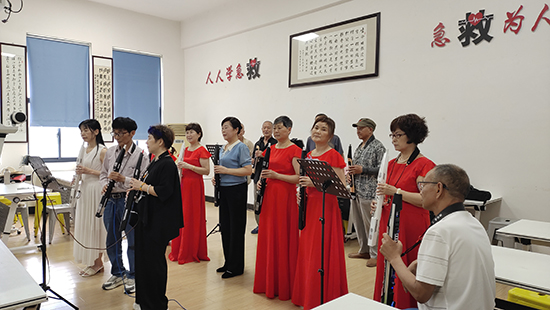 排練過程中,老年朋友們通力合作,現場充滿歡聲笑語。學員李阿姨笑著說:“參加電吹管班不僅學會了一門樂器,還結識了許多志同道合的朋友,每次排練都特別開心,期末匯報演出更是讓我們有了展示的舞臺!”