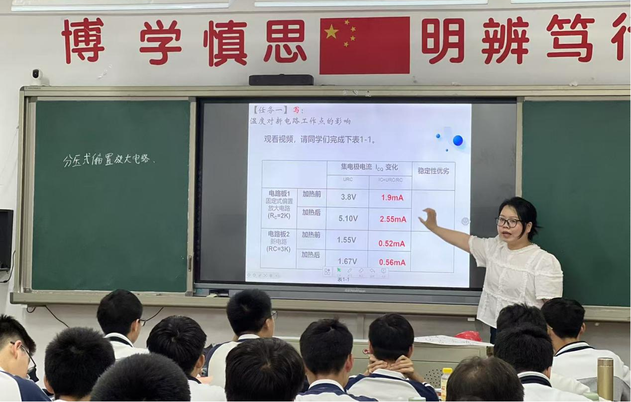 朱彬如老師在《分壓式偏置放大電路》一課中,通過理論推導與實物演示,生動講解分壓式偏置電路的結構特性、靜態工作點,結合實際電路直觀展現工作點設置,學生積極參與討論,現場互動氛圍熱烈。