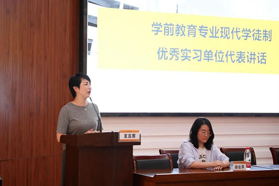 優秀學員代表、2201班俞思媛同學分享了實習感悟:“在師傅的悉心指導下,我不僅掌握了保育實操技能,更深刻理解了幼兒教師的職業使命。”學前教育專業部教研組長章璇老師從專業建設角度,詳細介紹了本次現代學徒制的教學實施方案和多元化考核評估體系。