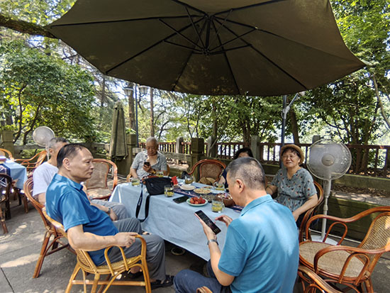 上午10時,退休教職工們沿著綠樹掩映的路徑前行,一路欣賞平山的秀美景色,最終抵達半山腰的鶴過軒休閑茶室。在這里,大家圍坐一堂,手捧熱氣騰騰的香茗,暢談生活瑣事,齊聲歌唱,共同度過了一段悠閑而愜意的快樂茶時光。
