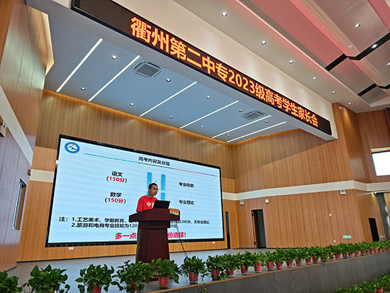 會議伊始,高三年級段段長潘將來老師為與會家長帶來了全面、深入的高考政策解讀。潘老師不僅詳細剖析了最新高考動態與規則,更結合學校歷年高考的成功經驗,精準分析了衢州第二中專在高考備考中的獨特優勢與亮點,為家長和學生們指明了清晰的前行方向,增強了備考信心。