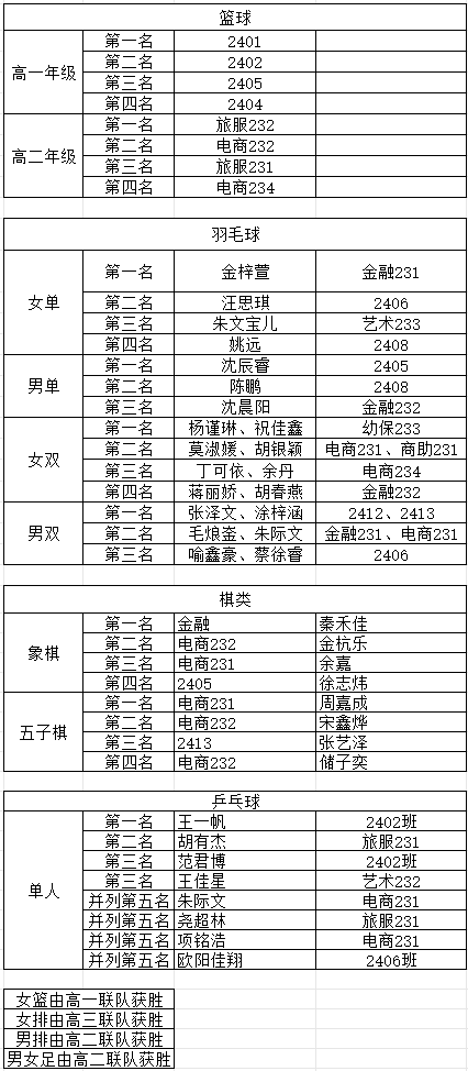 經(jīng)過(guò)激烈角逐,各個(gè)項(xiàng)目的獲獎(jiǎng)名單終于揭曉。以下是本次青荷體育節(jié)的獲獎(jiǎng)名單: