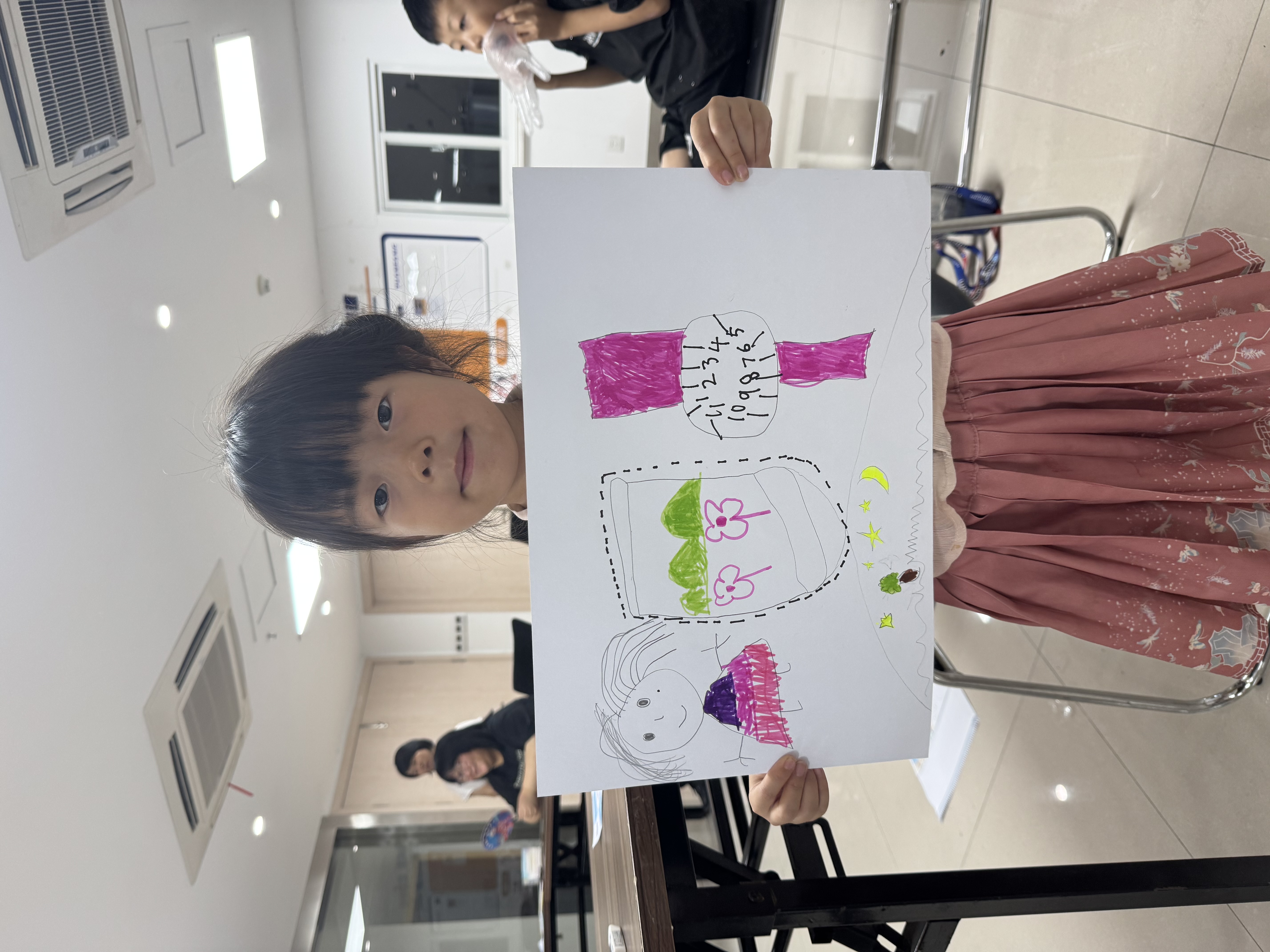 下午,社區邀請轄區D1藝術空間的專業老師帶來《時間聯想》創意思維繪畫課。“沙漏可以代表時間”“鐘表指針轉一圈就是一天”“年輪可以代表樹木生長的時間”,在老師們的引導下,孩子們圍繞沙漏、鐘表等時間載體展開想象,用藍色渲染星空、用綠色勾勒草地,一幅幅時間流轉的創意畫逐漸成型。