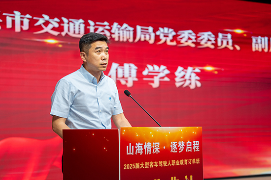 嘉興市交通運輸局副局長傅學(xué)練致辭,他首先恭喜同學(xué)們順利完成學(xué)業(yè),表示公交車駕駛員是展示交通運輸行業(yè)的窗口,希望同學(xué)們堅守職業(yè)道德,用優(yōu)質(zhì)的服務(wù)贏得尊重,用良好的職業(yè)操守樹立口碑,成為社會文明與行業(yè)正能量的傳遞者。