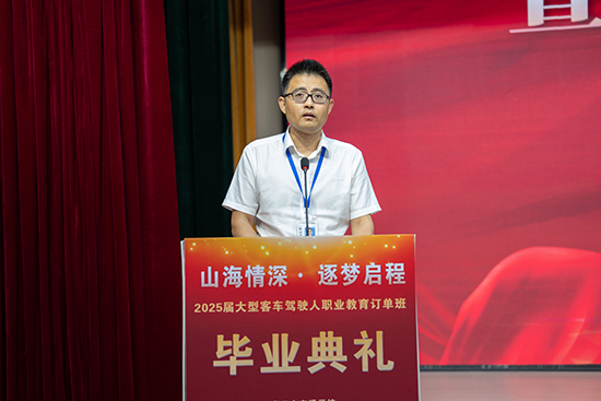 7月4日,2025屆大型客車駕駛?cè)寺殬I(yè)教育訂單班畢業(yè)典禮在嘉興市交通學(xué)校(嘉興交通技工學(xué)校)報告廳隆重舉行。嘉興市交通運輸局副局長傅學(xué)練、嘉通集團(tuán)總經(jīng)理何宇健、四川省阿壩州若爾蓋縣相關(guān)領(lǐng)導(dǎo)、學(xué)校主要領(lǐng)導(dǎo)及2025屆大型客車駕駛?cè)寺殬I(yè)教育訂單班全體師生參加。