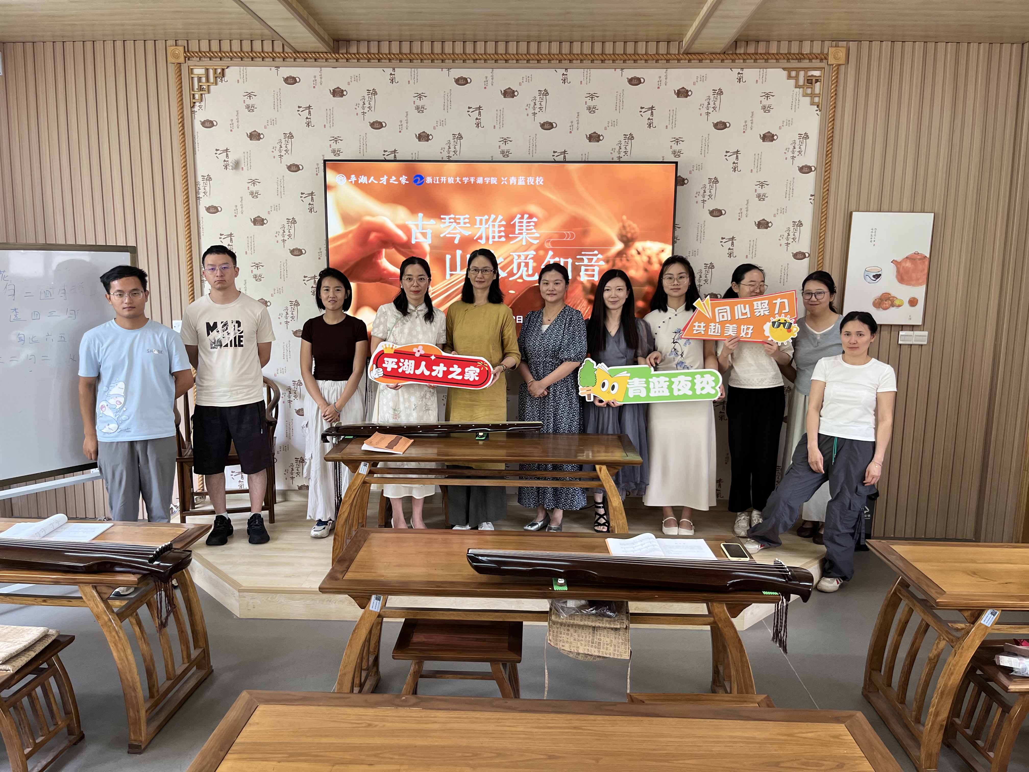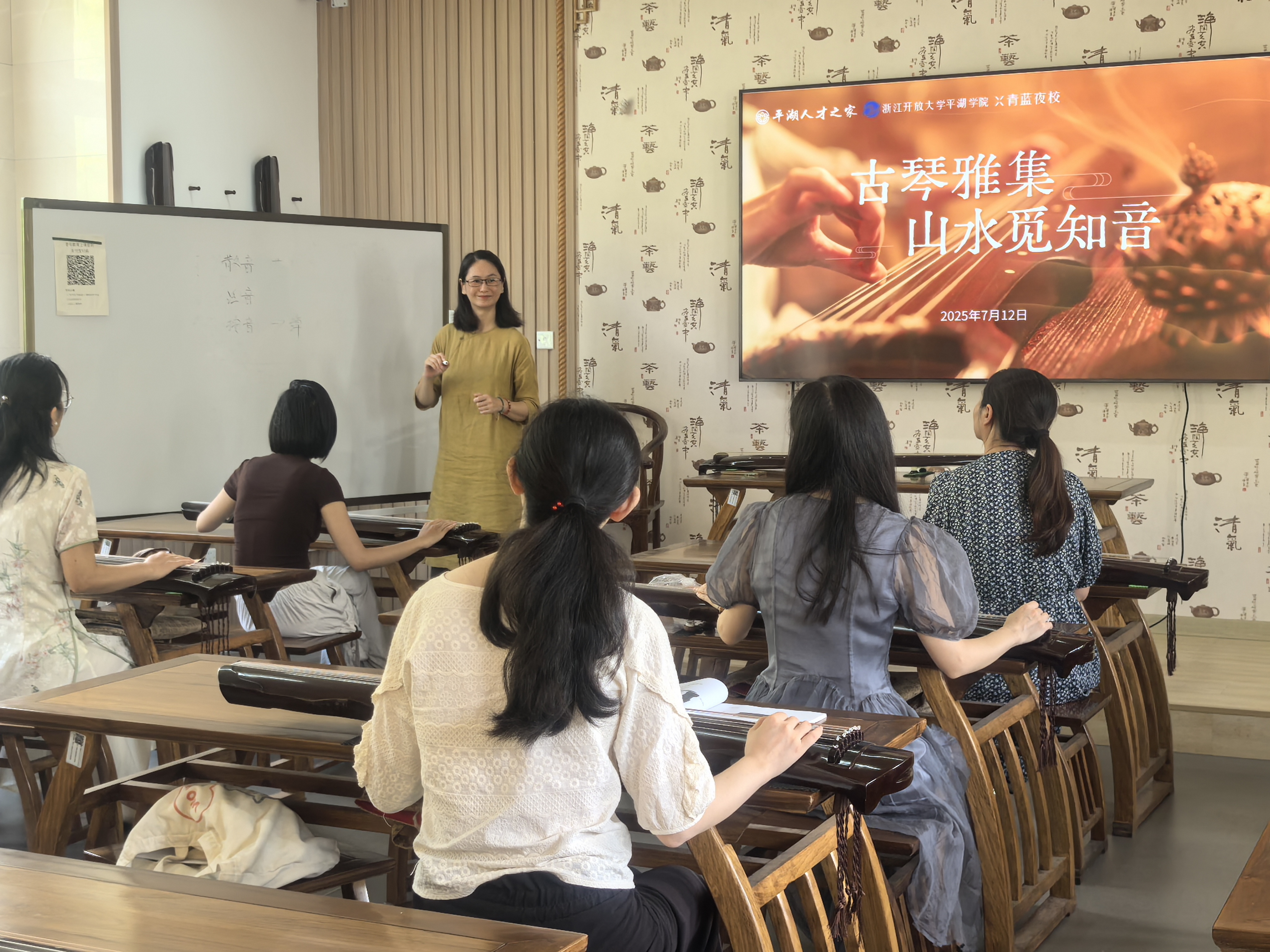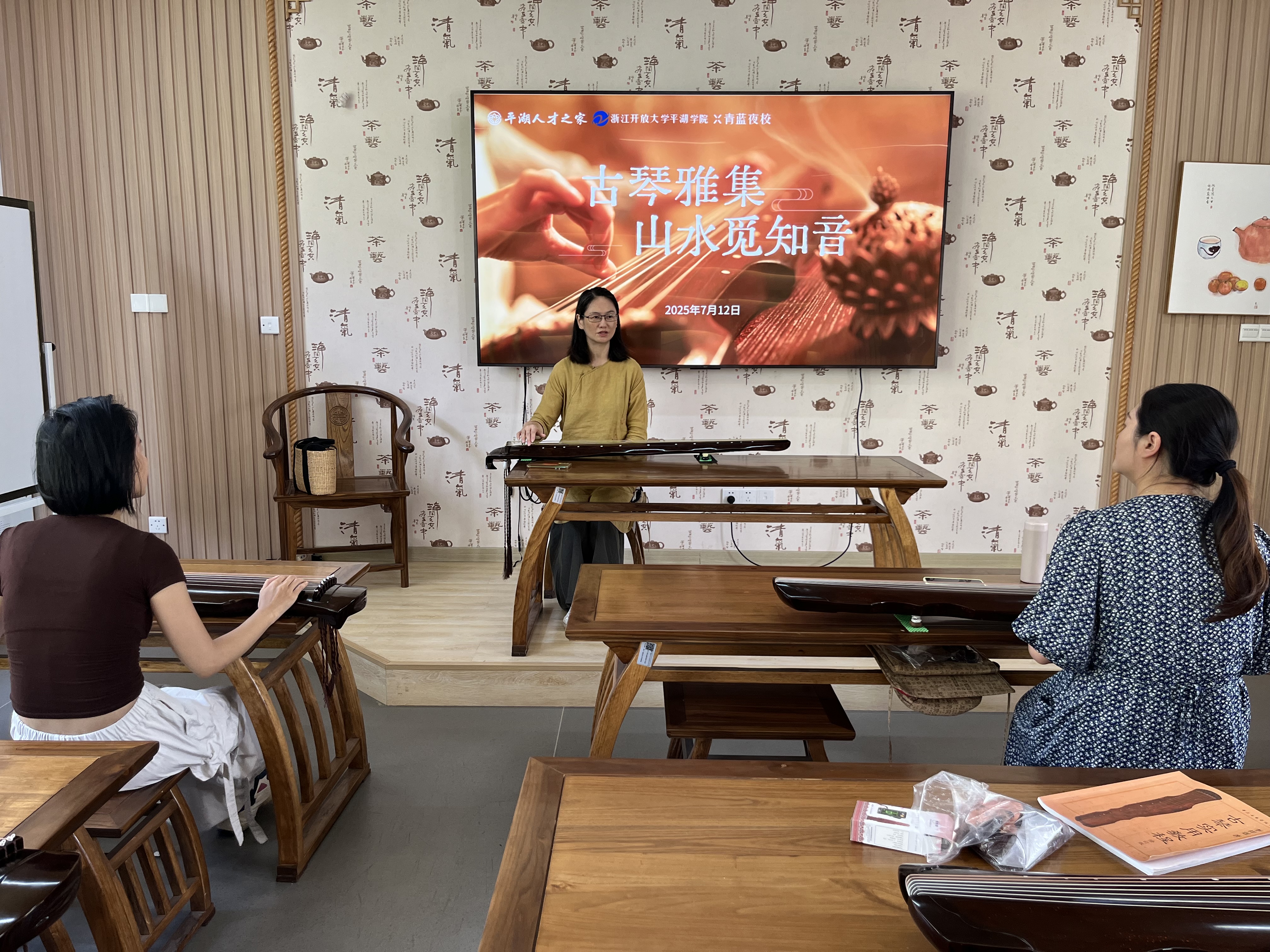 7月12日上午,浙江開放大學平湖學院北教學樓內琴韻悠揚,一場由學院與平湖人才之家聯合主辦的《古琴雅集 山水覓知音》古琴體驗課在此拉開帷幕。作為“青藍夜校”項目的重要組成部分,此次課程吸引了十余名才華橫溢的平湖人才前來參加,共同領略古琴藝術的獨特魅力。