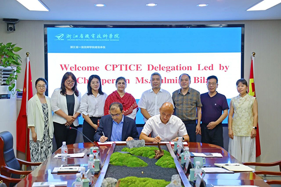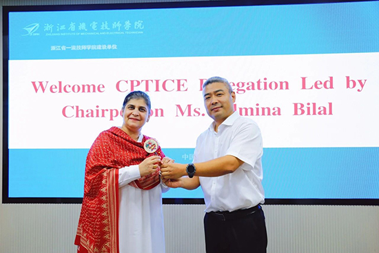 7月12日,中巴職業(yè)教育國際交流活動在浙江機電技師學院舉行。巴基斯坦國家職業(yè)技術教育委員會主席、中巴產教合作卓越中心巴方主席古爾米娜·比拉爾·艾哈邁德(Gulmina·Bilal· Ahmad),中巴國際產教合作聯盟秘書長阿瑪爾·穆罕穆德(Muhammad·Ammar)等嘉賓蒞臨現場。學院黨委副書記、院長朱旦標,黨委副書記、紀委書記麻劍波,黨委委員、副院長陳利軍、丁軍凱、胡青玲,黨委委員錢鑫鑫及相關負責人出席活動。