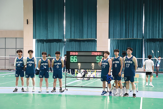隨著裁判一聲哨響,校黨委書記范曉春為決賽開球,比賽正式拉開序幕,兩隊球員立刻展開了激烈拼搶??旃シ磽糁械木珳蕚髑颉⒒@下卡位時的強硬對抗、外線防守時的果斷蓋帽,接連上演的精彩瞬間讓現場歡呼聲此起彼伏。23市政中專配合默契,開場處于領先狀態。球員們加油聲,現場觀眾的吶喊聲充滿整個賽場。矯健的步伐、華麗的運球、三分的命中加上緊密的配合,23市政中專最終以66:53結束本屆比賽。