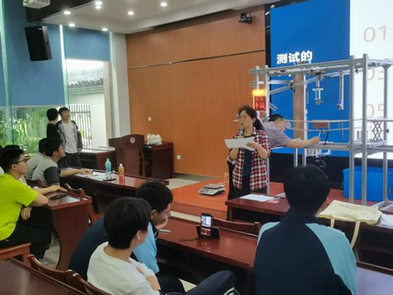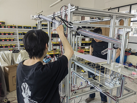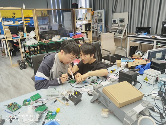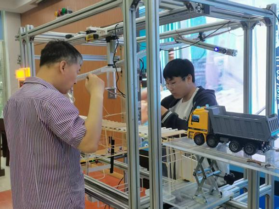 值得一提的是:竹模作品所需的模型加載設備是由學校師生團隊自行設計制作的。在學校小魯班創客坊(鄭強勝大師工作室)的教師帶領下,建筑智能化專業學生應用直線電機、光電感應、3D打印等技術,自制線路板、自研配件、邏輯編程,先后經過10個版本的線路板、近萬行程序語言的反復摸索,成功研制出一款“多功能智能化橋梁模型加載裝置 ”,實現多種荷載作用下的橋梁模型強度、剛度測試,并具備人機同裁功能。