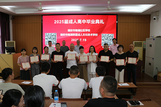 7月19日下午,瑞安市錦湖社區(qū)學(xué)校文化禮堂國(guó)歌嘹亮,莊重開啟2025屆首批成人高中畢業(yè)典禮。瑞安市錦湖街道社會(huì)事務(wù)辦副主任狄益斌、錦湖社區(qū)學(xué)校副校長(zhǎng)(瑞安市職業(yè)中等專業(yè)教育集團(tuán)學(xué)校總務(wù)處主任)謝統(tǒng)、教師代表陳震宇、2025屆成人高中班班主任徐定奎等領(lǐng)導(dǎo)嘉賓出席,與111名滿懷喜悅的畢業(yè)生齊聚一堂,共慶學(xué)業(yè)有成。典禮由常務(wù)副校長(zhǎng)張?jiān)僖嬷鞒郑F(xiàn)場(chǎng)氛圍熱烈而莊重。