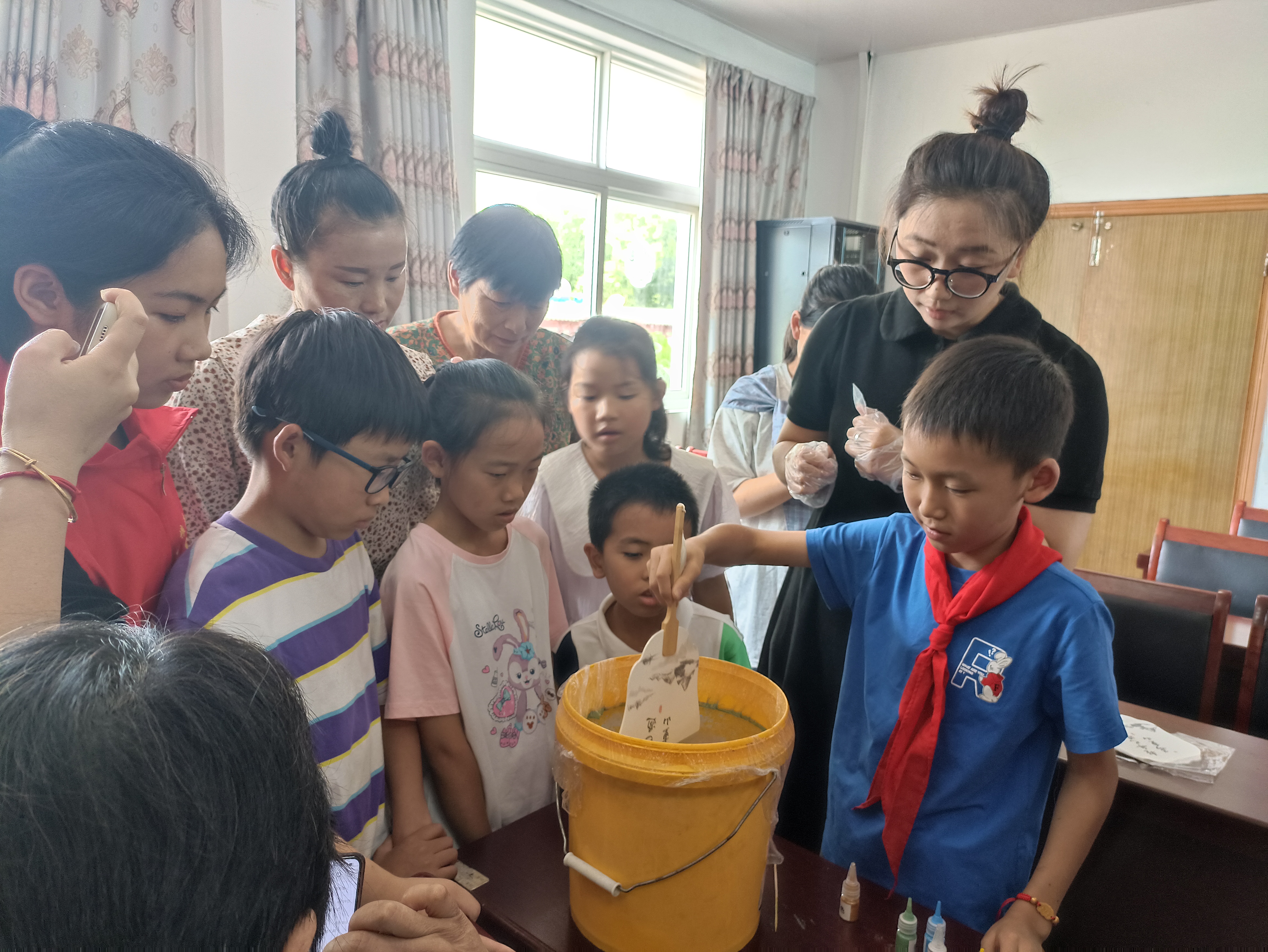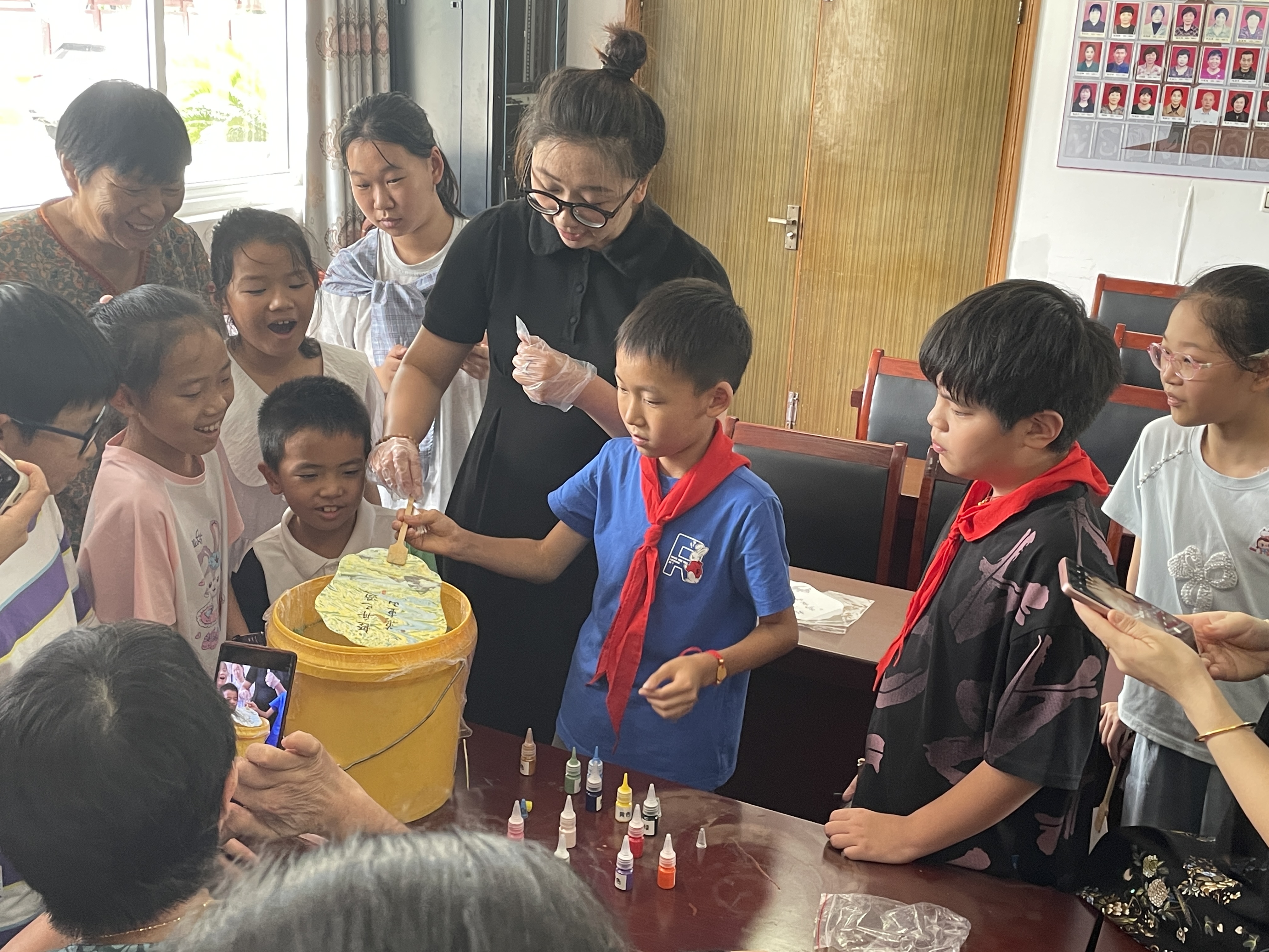 實(shí)踐環(huán)節(jié)點(diǎn)燃了現(xiàn)場(chǎng)的熱情,成為一次生動(dòng)的終身學(xué)習(xí)實(shí)踐課。沈老師清晰示范后,親子家庭齊動(dòng)手:將心儀的色彩滴入盛有八分滿清水的容器,看著漆液在水面自然暈開。孩子們或輕吹水面,或用竹簽小心引導(dǎo),盆中漆液隨之變幻出流動(dòng)的紋路。接著,大家手握素扇,全神貫注地調(diào)整角度,讓扇面輕觸水面——沉入、提轉(zhuǎn),一氣呵成。神奇的漂漆工藝借用水面流動(dòng)的肌理,呈現(xiàn)出柔和圓潤(rùn)、連綿不絕的獨(dú)特圖案。最終,每一把扇面都獨(dú)一無(wú)二,或清新雅致,或絢麗多彩,凝結(jié)著親子合作的巧思與創(chuàng)意。活動(dòng)現(xiàn)場(chǎng),孩子們神情專注地投入創(chuàng)作,家長(zhǎng)們則化身“學(xué)習(xí)伙伴”和“記錄者”,用手機(jī)捕捉珍貴瞬間,并不時(shí)交流著對(duì)傳統(tǒng)工藝的感悟,溫馨的親子互動(dòng)氛圍與濃厚的學(xué)習(xí)氛圍相互交融。
