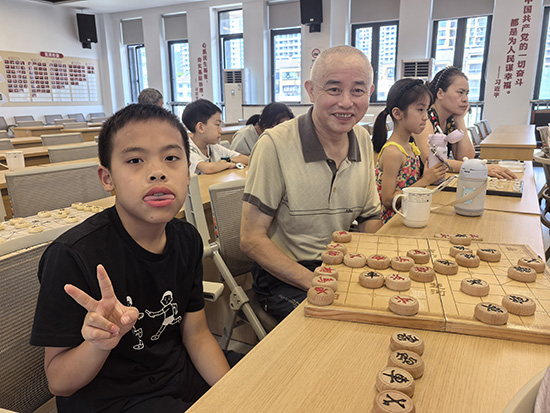 棋盤兩側,是知識與經驗的溫暖交匯。專業教練蔡茜昭從象棋淵源講起,耐心拆解“車行直路馬行斜”的基礎規則。老人們化身為“銀發助教”,用布滿歲月痕跡的手,輕輕引導孩子們擺正“車、馬、炮”,一招一式傳遞著無聲的關懷;孩子們則仰起小臉,眼神清亮,專注聆聽每一句講解。求知若渴的目光與慈祥包容的笑容在楚河漢界之上交織,棋枰化為溫情的代際對話平臺。