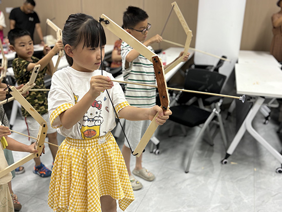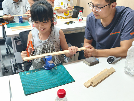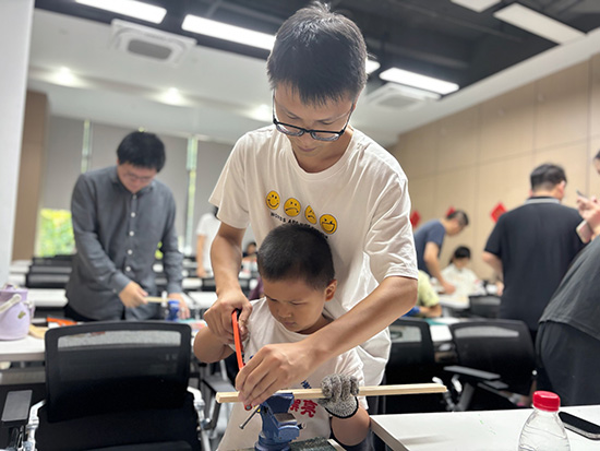 精準(zhǔn)聚焦父職教育,方能破解親子陪伴難題。活動(dòng)籌備階段,東信社區(qū)婦聯(lián)便敏銳捕捉到社區(qū)家庭教育中“父親缺位”這一普遍痛點(diǎn)。“不少媽媽跟我們反映,爸爸們其實(shí)想?yún)⑴c孩子的成長(zhǎng),卻總苦于沒(méi)合適的渠道。”社區(qū)婦聯(lián)主席姚晨霞道出活動(dòng)設(shè)計(jì)的初衷,“所以我們特意設(shè)置了木工與射箭環(huán)節(jié),就是想契合父親動(dòng)手能力強(qiáng)、偏愛(ài)競(jìng)技的特點(diǎn),讓他們?cè)趨f(xié)作中自然與孩子建立深度聯(lián)結(jié)。”從挑選木料、細(xì)細(xì)打磨到安裝弓弦,父親們寬厚的手掌包裹著孩子的小手,一同感受木料的細(xì)膩紋理與工具的暖暖溫度。木藝師傅也不禁贊嘆:“婦聯(lián)這主意真妙!木弓的張力得靠平衡,父子間的默契不也在這一推一拉里慢慢磨合出來(lái)了嘛。”